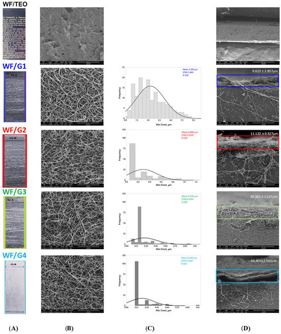 Visual and morphological analysis of WF/G1–G4 fiber layers: (A) macroscopic view (1:2); (B) SEM top view of PLA fiber mats; (C) histograms of minimum Feret fiber distribution evaluated from N = 150 measurements; (D) SEM cross-section with the estimated thickness of the mat given as mean ± standard deviation (SD).