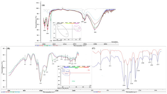 Aligned FT-IR spectra of (A) WF/G1, WF/G2, WF/G4, WF/TEO, and PLA from 1500 to 3400 cm−1 wavenumber and PCA scores and clusters; (B) WF/G1, WF/G2, WF/G3, and WF/TEO and (C) WF/G4 and PLA from 600 to 1500 cm−1 wavenumber; (A1) the principal component analysis (PCA) scores and clusters of WF/G1, WF/G2, WF/G4, WF/TEO, and PLA spectra for 1500 to 3400 cm−1; and (B1) the PCA scores and clusters of WF/G1, WF/G2, WF/G4, WF/TEO, and PLA spectra in the fingerprint region (600 to 1500 cm−1).