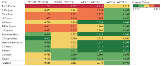 A total number of 14 VOCs originating from the TEO extract were tentatively identified in WF/G films (Table 2) using NIST library. A semi-quantitative method was applied to estimate the concentration of the major VOCs, using a procedure previously described [2,22]. The most abundant constituents of VOCs in the WF/G films is thymol, ranging from 50.65% in WF/G2 to 63.08% in WF/G4. Thymol concentration was reported as the highest in thyme essential oils by many studies [2,22,39]. Other major constituents tentatively identified in WF/G are o-cymene, 1-R α-pinene, and carvacrol, but also santolina triene. Researchers [40] found p-cymene (28.55%) and carvacrol (3.14%) alongside thymol (43.19%) in thyme essential oil. Minor compounds were also present in the WF/Gs and are indicated in Table 2.