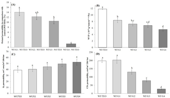 Low values for water solubility indicate a resistance of the films against water molecule penetration, a feature necessary in commercial films [36]. The bio-based films exhibited values of solubility in water ranging between 63.67 ± 7.04 and 81.33 ± 6.45% (Table 1) and showed no significant differences (p-value = 0.033) among them, despite a noticeable decrease in water solubility correlated with an increase in film thickness from WF/G1 to WF/G4 and better mechanical strength. The lower moisture content of the composite with the increase in PLA mat thickness could be also positively correlated with the WVP decrease, WF/G4 showing the lowest moisture content and WVP from all tested formulae (Section 3.2.3). In various food packaging applications, a lower moisture content than in WF/G films would be necessary; thus, crosslinkers like transglutaminase or gluten fractions could be added to improve the composites’ structure and expand the applicability range.