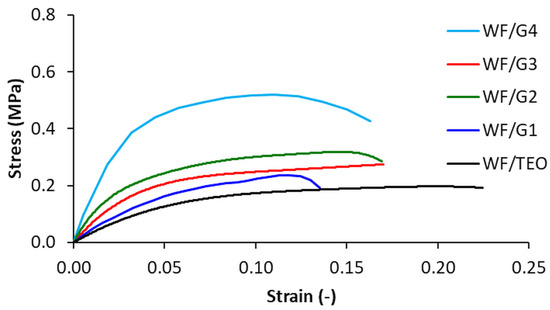 The vibrations with spikes at 1540 cm−1 were related to bending groups of N–H (amide type II) visible for WF/G1, WF/G2, WF/G3, and WF/TEO spectra and less evident in WF/G4 and PLA, while at 1634 cm−1, the vibrations were associated with the unsaturation of the benzene ring, also identified in other studies [32].