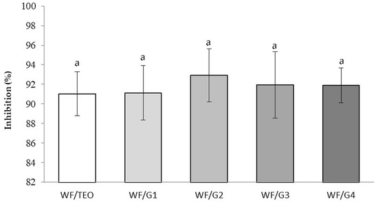 Active antioxidant packaging is used to extend the shelf life of foods and minimize exposure to oxidative stress, especially of foods rich in oxygen-sensitive fats [53]. Non-significant differences (p > 0.05) were registered between WF/G1, WF/G2, WF/G3, and WF/TEO, demonstrating that covering films with a PLA fiber mat did not change the antiradical activity. WF/TEO presented a free radical inhibition value of 89.03 ± 8.9% (Figure 8). This is also related to the comparable capacity of WF/G films to retain active molecules such as carvacrol, thymol, 2-carene, and borneol, as shown in Figure 5. The main volatiles of TEO, thymol and carvacrol, acted as hydrogen donors that stabilize free radicals by forming stable phenoxy radicals, which explains the high antiradical activity observed.