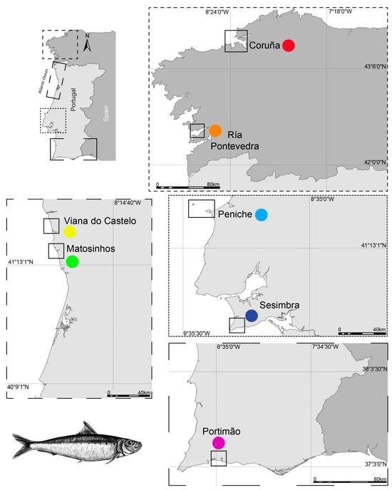 The European sardine, Sardina pilchardus (Walbaum, 1792), is an abundant small pelagic fish in the northeast Atlantic Ocean, occurring from the North Sea to Senegal, as well as in the Mediterranean Sea []. In European Atlantic waters, the commercial fishery targeting S. pilchardus is monitored by the International Council for the Exploration of the Sea (ICES), which surveys three major stocks: the southern Celtic Sea and English Channel stock, the Bay of Biscay stock, and the Cantabrian Sea and Atlantic Iberian waters stock (which will be referred to, for simplicity, as “the Iberian stock”) []. The Iberian stock distributes along the Atlantic coast of the Iberian Peninsula and is commercially explored by Portugal and Spain using purse-seines []. The European Market Observatory for Fisheries and Aquaculture (EUMOFA) indicates that S. pilchardus ranks among the top ten most landed and valued fishery products in Portugal []. The Food and Agriculture Organization of the United Nations (FAO) further acknowledges that Portugal alone contributes an important part of S. pilchardus captures in European Union (EU) waters (as over 25,000 tons were landed in Portugal in 2022) [].