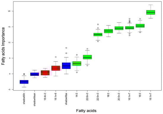 Box plots of Z-scores obtained by the Boruta algorithm to determine which fatty acids (FAs) in the white muscle of Sardina pilchardus are the most significant to successfully discriminate individuals landed at different locations along the Iberian Atlantic coast. As the Boruta algorithm first duplicates the dataset, shuffles these values (termed shadow features), and finds their importance (using a random forest classifier) to then compare the importance of the real data with that of its shadow, the FAs with higher Z-scores than the maximum Z-scores of their shadow features (shadowMax) are considered significant for the discrimination. Green box plots indicate the significant FAs, and the higher their position in the plot, the higher their importance for discriminating S. pilchardus from the landing locations. Box plots in red indicate FAs that were not considered significant for the discrimination, as they did not overcome the shadowMax.