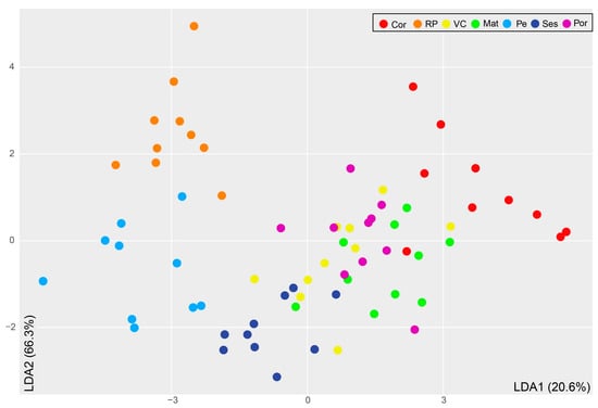 Linear discriminant analysis (LDA) of Sardina pilchardus collected from seven locations along the Iberian Atlantic coast based on the fatty acid profile of their white muscle, considered most significant by the Boruta algorithm to discriminate them. The plot evidences the distribution of the individuals from each location (n = 10) in the space defined by the first and second discriminant functions (LDA1 and LDA2, respectively), which explained 20.6% and 66.3% of the observed variance, respectively. Abbreviations: Cor: Coruña; RP: Ría de Pontevedra; VC: Viana do Castelo; Mat: Matosinhos; Pe: Peniche; Ses: Sesimbra; Por: Portimão.