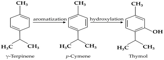 - Krause, S.T.; Liao, P.; Crocoll, C.; Boachon, B.; Förster, C.; Leidecker, F.; Wiese, N.; Zhao, D.; Wood, J.C.; Buell, C.R. The biosynthesis of thymol, carvacrol, and thymohydroquinone in Lamiaceae proceeds via cytochrome P450s and a short-chain dehydrogenase. Proc. Natl. Acad. Sci. USA 2021, 118, e2110092118. [Google Scholar] [CrossRef]