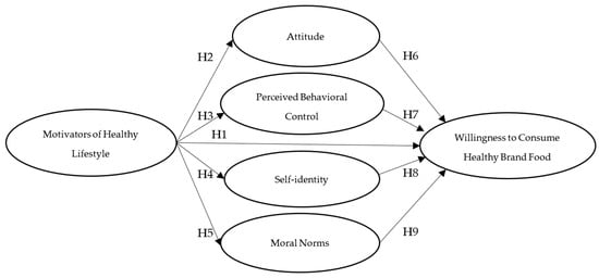 Motivators for a healthy lifestyle significantly influence moral norms. Previous studies have established that health concerns, disease prevention aspirations, general well-being, environmental awareness, and ethical considerations are potent motivators in selecting healthy food and adopting healthy lifestyles. These motivators not only influence direct consumption decisions but contribute to forming positive attitudes toward a healthier lifestyle [,,,,]. Furthermore, Honkanen et al. [] and Habib et al. [] demonstrated how motivators for a healthy lifestyle are closely linked to forming and strengthening moral and ethical norms. Their study reveals that consumers motivated by health and sustainability tend to internalize these values as part of their ethical code, influencing their future food choices. Previous research has demonstrated how health motivators significantly contribute to forming positive moral attitudes toward sustainable food choices and dietary patterns. Studies have found that individuals with health-driven solid motivations tend to develop more conscious moral attitudes toward organic food and plant-based diets [,]. Similarly, Enriquez and Archila-Godinez [] found that individuals who exhibit stronger motivation toward a healthy lifestyle tend to develop more rigorous ethical norms regarding responsible consumption and personal care. This positive impact of health motivators on moral attitudes gives us hope for a healthier future. Therefore, the following hypothesis is proposed: