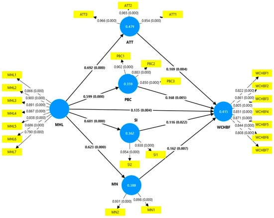 To complement the discriminant validity analysis, the heterotrait–monotrait ratio (HTMT) analysis was additionally performed. Under this criterion, to meet discriminant validity between constructs, HTMT values should be below 0.85 or 0.90 in some cases []. In the present work, the HTMT values between constructs are all below 0.85, except PBC with MN (0.871), but they are still close to the 0.85 threshold, so they are considered acceptable. The other values, such as MHLs with ATT (0.728) and WCHBF with ATT (0.593), essentially meet the criterion, confirming discriminant validity (Table 5).