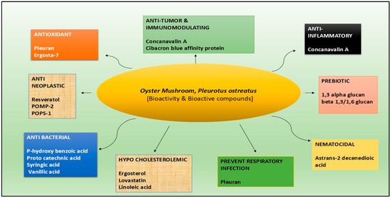 In summary, oyster mushrooms Pleurotus genus are one of the most known functional foods and attract the interest of researchers because of the presence of bioactive compounds and their positive effects on human health. Moreover, they are well known for their high nutrition content with a significant amount of protein content as well as with the presence of minerals, like iron and phosphorous, and vitamins, like riboflavin, thiamine, ergosterol, niacin, and ascorbic acid. Additionally, they are well recognized as a healthy food because of their low fat and energy content and by the presence of bioactive compounds, like terpenoids, flavonoids, like polyphenols, and polysaccharides, like glucans and glycoproteins. Furthermore, several preclinical studies have demonstrated that oyster mushrooms are hepatoprotective, immuno-modulating, anticancerous, antibacterial, antiviral, and hypo-cholesterolemic mediators. Moreover, their ability to prevent cardiovascular diseases and their potential to fight against cancer due to the presence of high antioxidant content, which reduces oxidative damage, make them an ideal candidate for nutraceutical production [57,58,59].