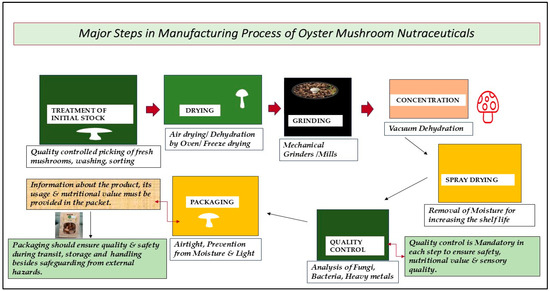 According to recent trends, the major priority in food manufacturing and consumption is the functional components of the food. Functional ingredients in food are directly proportional to the antioxidant potential of the food. Based on recent research regarding Pleurotus ostreatus and the effect of substrate, it is clearly reported that the antioxidant capacity of Pleurotus ostreatus is influenced by the type of substrate [60]. Therefore, it is very important to optimize the culture conditions and physical parameters, especially the substrate constituents, before starting the large-scale cultivation of that specific mushroom for enhancing the maximum antioxidant potential. The procedure of manufacturing mushroom powder, especially for supplements, is quite precise and involves six important steps. The process involves first picking fresh and undamaged mushrooms, which are then washed and sorted out according to size. Quality control is very important at this initial treatment of stock stage, because the raw material, which is used in the production process, determines the quality of the final product [61]. The selected mushrooms are thoroughly washed to eliminate any form of dirt or any other unwanted particles. After cleaning the mushrooms, the mushrooms are dried, which serves to decrease the moisture level in them; this is important for avoiding spoilage and increasing the shelf life of the mushrooms. The drying process can be carried out using various methods, including air-drying, which is a physical process in which mushrooms are left to dry in the open air. The second drying method is dehydration using ovens or dehydrators at specific temperatures to dry the produce. Freeze-drying, another technique, is even more sophisticated, where the mushrooms are frozen and then dehydrated under vacuum to retain the nutrient value and taste [13]. Once dried, these are crushed or ground into fine particles using mechanical mills or grinders. This step is vital to ensure that the desired particle size distribution is attained, because this, in turn, will improve the solubility and, hence, the bioavailability of the active compounds in the final product [62]. Additionally, the mushrooms are concentrated by vacuum dehydration to remove excess water and then spray-dried to produce a fine powder. It is an effective way of maintaining the nutrient content and, at the same time, having a consistent product [63]. Quality control is an important aspect to be maintained throughout the stages of the production of foods. Finally, the oyster mushroom powder is analyzed for the presence of fungi and bacteria, as well as heavy metals, as well as analyzing the nutrient content. This ensures that the product is safe for use and is also effective, according to the nutritional and medicinal requirements. Finally, the oyster mushroom powder is packed in airtight containers to avoid moisture and light, which can otherwise affect the quality of the product. It should be noted that the presentation of the product, the information that is to be provided to the consumer about the product regarding its usage, and nutritional value also are very important. Mushroom powder for dietary supplement production is a multistep procedure that entails a lot of precautions at every stage, starting from the process of sourcing the right raw materials to the checking of the quality and standard of the final product. Particularly, each stage is as important as the other to ensure the quality and safety of the oyster mushroom nutraceutical product [64,65]. Figure 2 shows a diagrammatic illustration of the six major steps in the manufacturing process from fresh oyster mushrooms to dried oyster mushroom powder nutraceuticals.