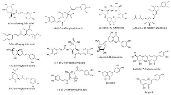 Caffeoylquinic acids, luteolin derivatives, and apigenin identified in the artichoke’s extracts.
