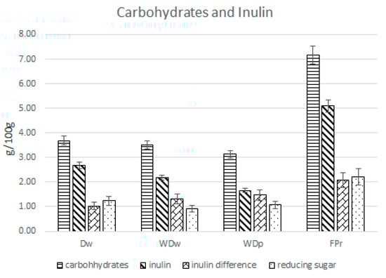 DW, WDW, WDP, and FPR showed inulin values accounting for 2.7 ± 17.8 (g/100 g ± RSD%), 2.2 ± 5.5 (g/100 g ± RSD%), 1.7 ± 13.5 (g/100 g ± RSD%), and 5.1 ± 17.1 (g/100 g ± RSD%) by weight, and total carbohydrates showed values accounting for 3.7 ± 14.2, 3.5 ± 15.8, 3.1 ± 7.9 and 7.2 ± 6.4 (g/100 g ± RSD%), respectively (Figure 2).