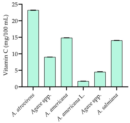Aguamiel is a rich source of water-soluble vitamins, essential for optimal bodily functions [29]. These vitamins act as cofactors in various metabolic processes, from energy production to the synthesis of neurotransmitters. Due to their rapid excretion requires continuous dietary intake [3,8]. Previous studies [3,9] have identified thiamine, riboflavin, pyridoxine, and niacin in aguamiel (Table 4), with vitamin B3 showing the highest mean concentration of 6.15 mg/100 mL in Agave species. Vitamin C is also present in aguamiel (Figure 1), although its concentration (1.70–23.20 mg/100 mL) may vary depending on factors such as agave variety, growing conditions, and climate [30].