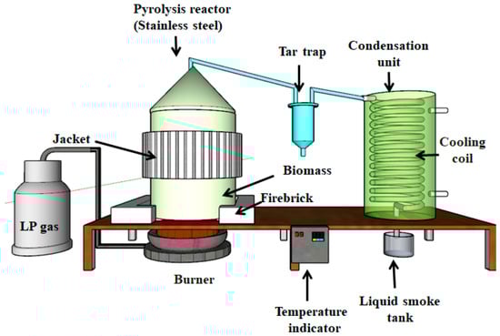 - Silaban, R.; Lubis, I.; Siregar, R.E.; Agus, P. Production of liquid smoke from the combination of coconut shell and empty fruit bunch through pyrolysis process. In Proceedings of the 4th International Conference on Innovation in Education, Science and Culture, ICIESC 2022, Medan, Indonesia, 11 October 2022. [Google Scholar] [CrossRef]