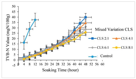 The TVB-N values of mackerel fish shown in Figure 2 on the first day in each mixture were 11.725, 12.194, 11.725, and 10.318 mgN/100 g. These values show that at the beginning of storage, the fish was categorized as fresh with a TVB-N value range of 10–20 mgN/100 g []. The addition of liquid smoke from OPEFB with a combination of turmeric can reduce TVB-N value in mackerel fish compared to control samples. The TVB-N value after soaking for 8 h was 28.901 mgN/100 g without preservative treatment from a mixture of liquid smoke with turmeric. This value is close to the maximum TVB-N value which is not good for consumption. Meanwhile, the TVB-N value obtained was 37.501 mgN/100 g at 12 h. Fish soaked using liquid smoke and CLS in 2:1 and 8:1 mixtures of turmeric and liquid smoke lasted for 40 and 48 h, respectively.