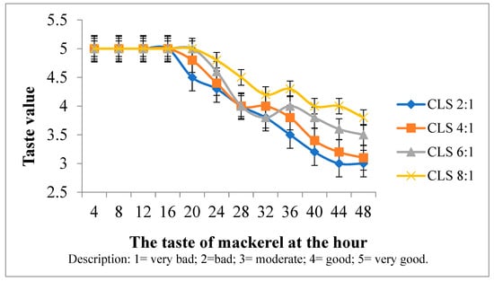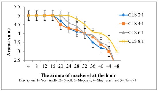 Aroma testing was conducted using the nose of each panelist. Meanwhile, the fish was steamed for 10 min before testing. In terms of aroma in mackerel (Figure 4) with CLS 2:1 and CLS 4:1 mixtures, the fish still had a good aroma at 20 h of soaking time. In contrast to the CLS 8:1 and CLS 6:1 mixtures of 32 h, the aroma of the fish still tasted good. After 10 h without treatment with the CLS preservative mixture, the aroma of the mackerel developed signs of spoilage. The smoky aroma produced was absorbed into the fish layer. The aroma became pungent due to the gradual reduction in acetic acid content. An unpleasant aroma could also be used as an indication of product damage caused by an oxidation reaction. Additionally, the occurrence of fat oxidation leads to an undesirable odor in fish []. In comparison to other variations, CLS 8:1 mixture showed an improved profile due to the ability to increase the amount of turmeric and increase the odor associated with liquid smoke. This is caused by the substances contained in turmeric, namely curcumin content which gives a distinctive aroma to the preservative mixture []. The preference value for preserved mackerel in the CLS 8:1 variation with a soaking time of 32 h was 65% at a score of 5, while others were 3 and 4. Similar results with the use of 3% liquid smoke from durian skin can still be accepted at 48 h [].