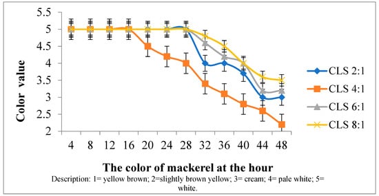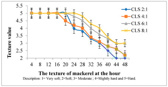 Based on Figure 5, the best texture of mackerel is in fish with the addition of liquid smoke in CLS 8:1 and CLS 6:1 mixture variations. In the CLS 2:1 and CLS 4:1 variations, the texture of the fish begins to change to soft at 32 h. Generally, the texture of the fish soaked in water without preservatives begins to change at 10 h because of increased bacterial growth. Fish experience a decline in quality when the texture of the meat becomes soft due to the enzymatic process in muscle tissue, such as cathepsin and collagenase. The cathepsin enzyme causes the texture to become soft due to protein degradation, while the collagenase breaks down polypeptide bonds []. For the presentation of preference at CLS 8:1 with a time of 32 h, 73% of panelists gave a score of 4 while others scored 3 and 5. At 48 h, the score given by all panelists was 3. According to Syarif et al. [], pyrolysis of ironwood at a temperature of 400 °C produced liquid smoke used to preserve mackerel. This was achieved by using 5% liquid smoke to maintain a shelf life of 3 days with a texture value lower than fresh fish.