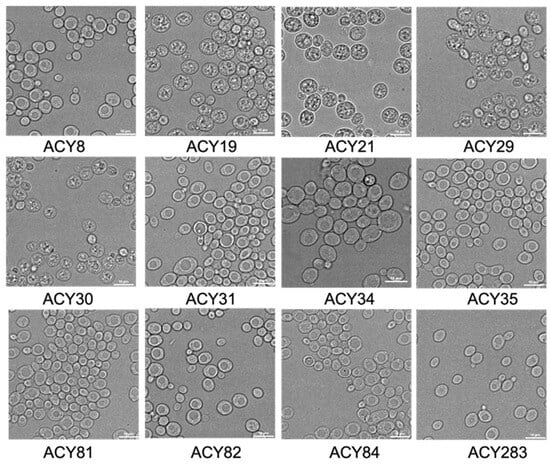 The results reveal notable differences in stress tolerance, metabolic adaptability, and fermentation performance among the evaluated yeast strains, providing critical insights into their potential for industrial applications. The distinct morphological characteristics observed in Figure 1 serve as a foundation for understanding strain-specific physiological traits. For instance, the larger, round cells of ACY29 (sweet mead) and the significant clustering of ACY84 (Irish ale) suggest cellular adaptations that may influence their fermentation efficiency and stress response. These findings align with previous studies that link yeast morphology to metabolic activity and environmental resilience [22,23].
