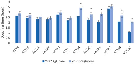 The impact of glucose concentrations on the growth rates of yeast strains was evaluated under 0.5% (glucose limitation) and 2% glucose (glucose-rich) conditions by comparing their doubling times (Figure 2). Most strains, including ACY8, ACY19, ACY21, ACY29, ACY30, ACY31, and ACY82, exhibited no significant differences in doubling times between the two glucose concentrations. This indicates that these strains have robust metabolic pathways capable of maintaining efficient growth even under glucose-limiting conditions, highlight their adaptability to environments with fluctuating nutrient availability [17]. In contrast, strains ACY34, ACY35, ACY81, ACY84, and the laboratory strain ACY283 showed significantly faster doubling times in the presence of 2% glucose compared to 0.5% glucose (p < 0.05 or p < 0.01). For instance, ACY81 displayed a pronounced reliance on higher glucose levels for optimal growth, suggesting a metabolic preference for nutrient-rich environments. Similarly, the lab strain ACY283 exhibited significantly slower growth under glucose limitation, reflecting its sensitivity to reduced glucose availability. These observations highlight differences in glucose utilization efficiency among the strains, with implications for industrial processes where glucose availability may vary.