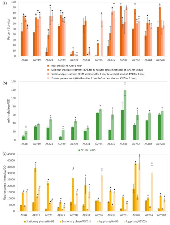 The heat tolerance of the yeast strains was evaluated under 45 °C heat shock conditions with and without pretreatments, including mild heat, sorbic acid, and ethanol (Figure 3a) [18,19]. Distinct phenotypic groupings were observed. Strains ACY19 and ACY29 exhibited high survival rates across all conditions, including in the absence of pretreatment. For ACY19, mild heat pretreatment further enhanced survival, highlighting its suitability for high-temperature industrial processes such as bioethanol production. In comparison, strains ACY8 and ACY21 showed moderate survival rates that substantially improved with sorbic acid and mild heat pretreatment, suggesting the activation of protective mechanisms under preconditioning [20]. Interestingly, strains ACY34 and ACY35, which showed poor initial survival, exhibited significant improvements when exposed to sorbic acid and ethanol pretreatments, indicating adaptability to preservative-rich environments.