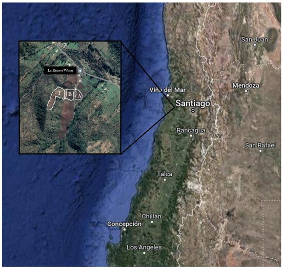 Grape berries were collected from the La Recova Winery located in the Valparaiso Region (33°16′26.5″ S 71°31′44.7″ W, Chile, Figure 1) during the 2021 vintage season. Two grape varieties were chosen, Chardonnay and S. Blanc, and were collected from three different geographic zones (Chardonnay from zone I and S. Blanc from zones A and B), as is delimited in Figure 1. Samples for each variety were randomly hand-picked following a zig-zag pattern in triplicate and transported refrigerated to the Fermented Food Laboratory at Pontifical Catholic University of Chile (Santiago, Chile). Upon arrival, the grapes were cleaned of plant debris and leaves, then pressed to obtain the juice, which was filtered with fine gauze to eliminate large particulates.