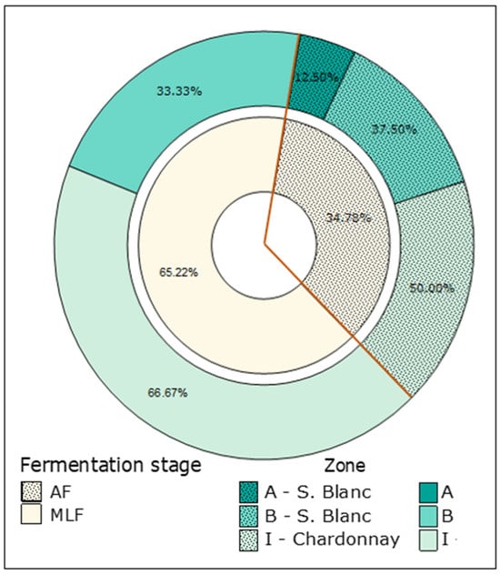 The Chardonnay cultivar in zone I yielded a significantly higher number of bacterial isolates compared to the Sauvignon Blanc in zones A and B during both AF and MLF. In contrast, Sauvignon Blanc from zone A had a low presence of culturable bacteria in both stages, resulting in the lowest percentage of isolates.