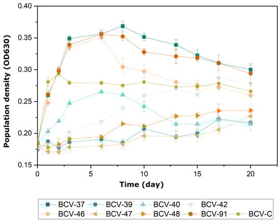 All selected isolates were able to grow in the enriched medium. However, the day at which each bacterium reached its growth peak was different. The control bacterium BCV-C (L. plantarum) was the fastest, achieving its growth peak in two days. The L. brevis strains (BCV-37, BCV-91, and BCV-46) expressed maximum growth within the first ten days of the experiment and then slowly declined in population. At the same time, higher populations were observed for these strains compared to the other five strains that displayed slower growth. For example, the strains L. brevis BCV-40 and BCV-42 showed a population density similar to the control bacterium BCV-C, although a sluggish growth response was observed. Similarly, the isolates BCV-48 (L. brevis), BCV-39 (Leuc. mesenteroides), and BCV-47 (Leuc. mesenteroides) exhibited even lower and slower growth than BCV-C, which might indicate that they were inhibited.