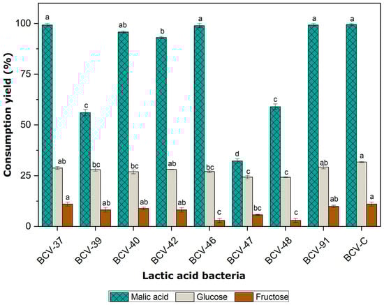 The consumption yields of L-malic acid, D-glucose, and D-fructose for each strain in the enriched medium are presented in Figure 4. The results were calculated based on the final concentration of each substrate. In this study, substrate consumption efficiency (consumption yield), expressed as a percentage, is defined as the difference between the initial and final concentrations of each independent substrate, divided by the initial concentration (as shown in Equations (3)–(5)).