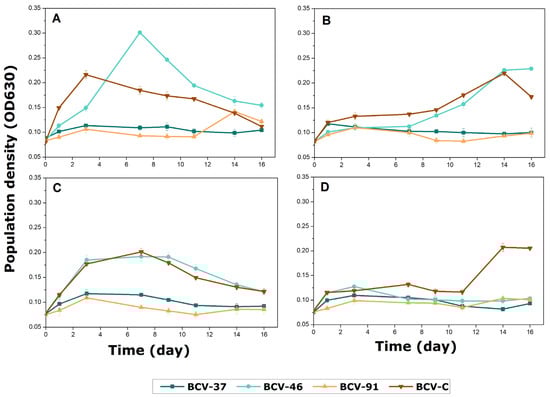 In Trial A, maximum growth was achieved within the first seven days of the experiment. Although the peak occurred four days later than in the control bacterium (BCV-C), the cell concentration was significantly higher, reaching an OD630 of 0.30. Afterward, the bacterial concentration decreased, eventually reaching an OD630 of approximately 0.15, which was still higher than that of the control. In Trial C, BCV-46 exhibited similar behavior to BCV-C, with both reaching a peak concentration of around OD630 0.19. A subsequent decrease in cell density followed the same pattern, with OD630 falling below 0.15 by the end of the experiment.