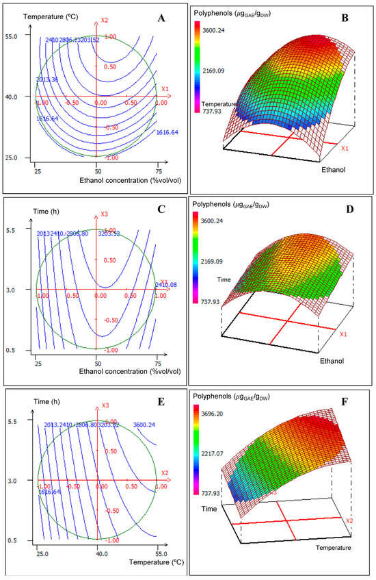Figure 1A,B show that the maximal extraction of polyphenols was achieved in the intervals with 45–60% ethanol and 40–50 °C. Figure 1C,D show that the maximal values of extraction were achieved with 45–55% ethanol and 5 h extraction time. Finally, Figure 1E,F show the maximal values at 40–50 °C and that time did not significantly affect the extraction yield.
