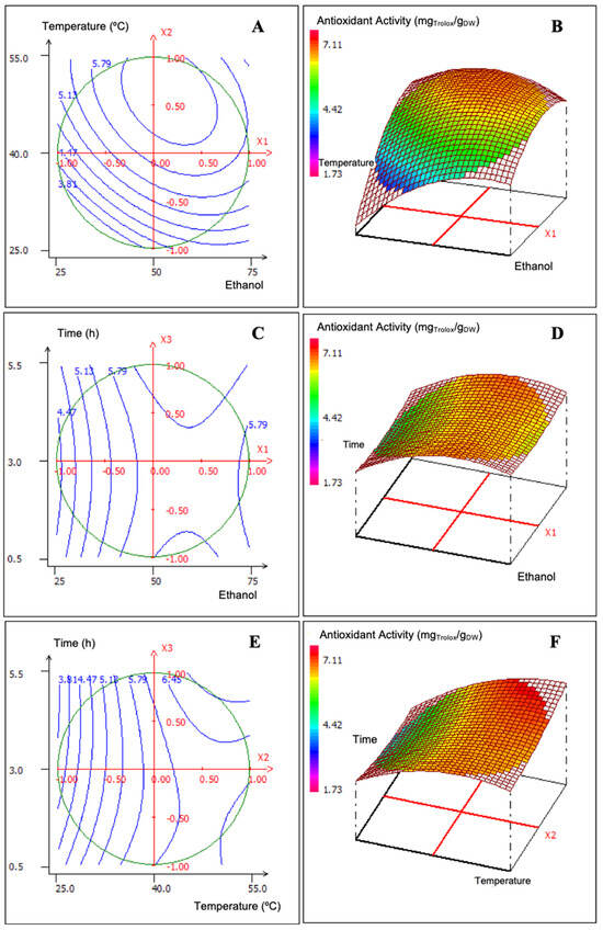 Three-dimensional contour and response surface plots of the variations in the antioxidant activity (mgTrolox/gDW) of the SE samples. (A,B) Results at fixed extraction time of 3 h. (C,D) Results at 40 °C fixed temperature. (E,F) Results at fixed ethanol concentration of 50%.