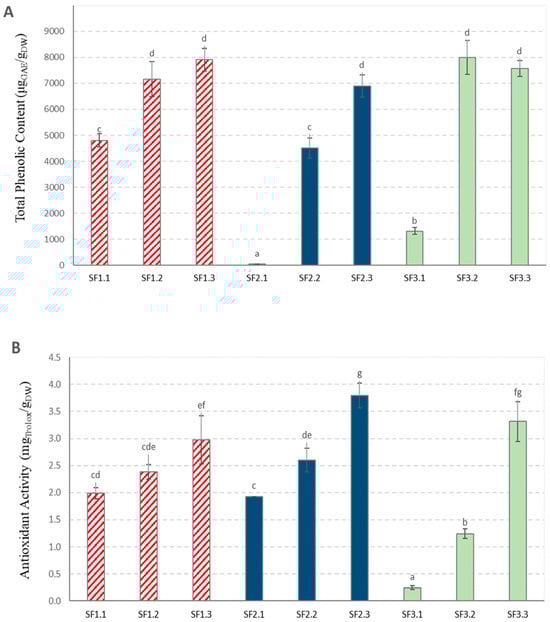 Total phenolic content (A) (expressed as µg of equivalent gallic acid per g of dried sample) and antioxidant activity (B) (expressed as mg of equivalent Trolox per g of dried sample) of SFE samples. Data are expressed as mean values ± standard deviation of triplicate samples. Different letters indicate significantly different values (p ≤ 0.05). Samples recovered from the first extractor: SF1.1, SF2.1, SF3.1. Samples recovered from separator A: SF1.2, SF2.2, SF3.2. Samples recovered from separator B: SF1.3, SF2.3, SF3.3. Samples from assay SF1