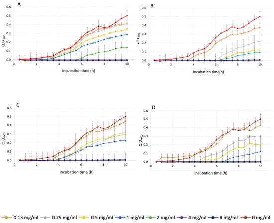 Growth curves of the multidrug-resistant E. coli C6840 strain in the presence of increasing concentrations (mg/mL) of each of the polyphenolic extracts: (A) SF1.3, (B) SF2.3, (C) SF3.3 and (D) Es. Each dot represents the mean value of triplicates, and bars indicate standard deviations; 0 mg/mL: optical density of control samples of bacterial growth without inhibitors.