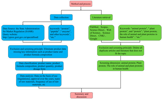 The first step is to collect, screen (including exclusion and inclusion), and statistically analyze products containing raw protein materials in Chinese health foods; the second step is to perform a narrative analysis, which involves literature collection, screening (including exclusion and inclusion), and categorization.