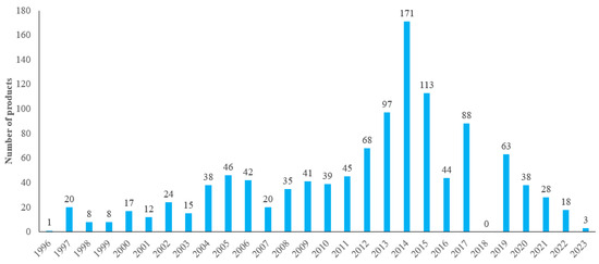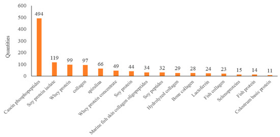 As can be seen in Figure 2, as of January 2024, data retrieved from the SAMR National Special Food Information Query Platform showed that a total of 1142 health food products containing protein-based ingredients were approved. Among them, the use of protein-based raw materials in health food was 0 in 2018, and it is presumed that the reason for this situation is related to the abolition of the Technical Code for the Inspection and Evaluation of Health Food (2003 version) in the “Decision of the Health Commission on Announcing the Invalidation of the Third Batch of Commission Documents (NHB [2018] No. 15)” in July 2018.