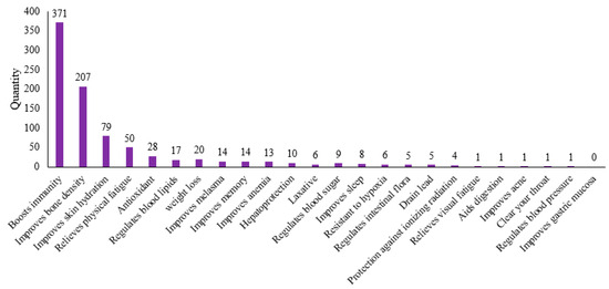 Based on the aforementioned statistics, the top four health functions, namely, boosting immunity, improving bone density, improving skin hydration, and relieving physical fatigue, are highlighted.