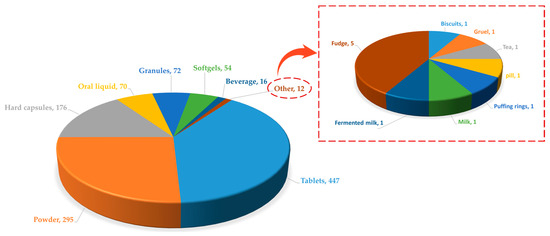 As can be seen in Figure 5, the current dosage forms of health food containing protein-based raw materials are mostly solid formulations, while liquid formulations account for less than 10%, which may be related to the poorer stabilization of liquid formulations. In general, when conditions such as pH, temperature, metal ions, and light in a liquid formulation change, the conformation of the protein may change, and biological activity may be lost [12]. The complexity of the environment is further enhanced when multiple raw materials are combined in a product, resulting in less stable liquid formulations with reduced absorption and utilization. Secondly, some orally consumed proteins and peptides have undesirable flavors, such as bitter, astringent, soybean, etc. In addition, the raw materials are easily hygroscopic, which makes it necessary to add a variety of flavor enhancers to liquid formulations to improve this effect. The solid preparation processing steps are simpler, and the processing cost is cheaper compared to the liquid preparation. Due to the better stability, the package material selection is also enhanced, the dose is clear, and the consumption is also more convenient. Solid dosage forms can also mask undesirable odors from raw materials through simple process steps, such as coating the outside of tablets and capsule shells for capsules, and such dosage forms also help protect against moisture.