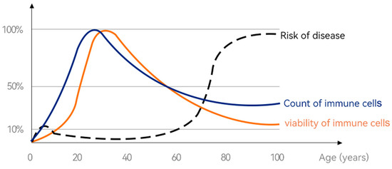 Changes in immune cell viability from “birth” to “lifetime”. (Immune cells’ senescence causes the body to age, and the key to anti-ageing lies in the vitality and number of immune cells. Figure courtesy of [22]).