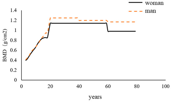 Osteoporosis (OP) results in decreased bone mass and bone strength, which predisposes to the development of fractures and bone fragility, where bone mineral density (BMD) of the hip and/or spine is the hallmark indicator for determining the occurrence of OP [46], and bone strength is equal to the addition of bone mass to BMD. OP is common in the elderly, and the incidence is significantly more than three times higher in women than in men [47]. Figure 7 demonstrates the changes in BMD over a person’s lifetime, with BMD seeing a gradual increase during adolescence [48] and a subsequent gradual decrease in BMD with increasing age, especially in the female population, where the rate of decrease in BMD is much higher than that of males [49]. Bones are mainly composed of bone (including compact bone and cancellous bone), bone marrow (divided into red bone marrow and yellow bone marrow), periosteum, and articular cartilage [50]. Among them, osteoclasts (OC) are mainly responsible for bone resorption and antagonize with osteoblasts, which are responsible for the formation of new bone to maintain bone homeostasis, a process called bone remodeling [51], which belongs to the category of bone metabolism. When there is an increase in osteoclast activity and/or a decrease in osteoblast activity, both result in greater bone resorption than bone formation, which leads to structural disruption of cancellous bone, a decrease in bone strength and, ultimately, can induce OP [50,52]. Currently, protein-based ingredients applied to increase BMD are mainly formulated through a pathway that promotes bone remodeling balance and calcium absorption.