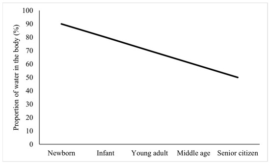 The functional evaluation method of health food that helps to improve the skin moisture condition was only carried out to evaluate human trial food experiments, and the evaluation method involved a clean cotton ball dipped in distilled water to clean the tested part of the subject in a quiet state. It was then dried for 15 min to measure moisture. At present, a total of 79 health food products containing protein-based raw materials to help improve skin moisture have been approved, mostly using collagen, fish collagen, marine fish skin collagen oligopeptide, and collagen peptide as the raw material of the product. The product audience is also mostly oriented to women. Studies have shown that the moisture in the skin of animals decreases with age [63], and Figure 8 demonstrates the change in moisture in the organism during a person’s lifetime [64].
