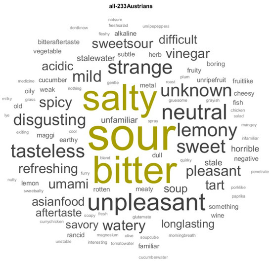 The most common taste descriptor for MSG was “sour”. This contrasts with the most used taste descriptor by people interviewed in Finland, Germany, and Italy: “salty” [24]. However, when considering the second and third descriptors, the Austrian group was more aligned with the German group, using “bitter”, “salty”, and “sour”, but quite different from the Finnish group, which used terms such as “salty”, “umami” and “meat”/“meaty”.