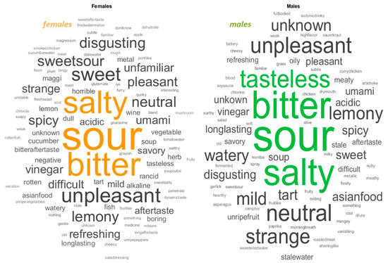 The most frequent word used by the entire group to describe the MSG solution was the word “sour”, with a word count = 71 (13.0%), followed by “bitter”, with a word count = 51 (9.3%), and then “salty”, with a word count = 47 (8.6%). Only a few recognized the taste of glutamate, with a word count = 8 (1.5%)—five females and three males. Other attributes with a word count bigger than/equal to 10 were “unpleasant”, with a word count = 20 (3.7%); “neutral”, with a word count = 17 (3.1%); “strange”, with a word count = 14 (2.6%); “sweet”/“tasteless”/“lemony”/“unknown”, each of which with a word count = 13 (2.4%); and “disgusting”/“mild”, both of which with a word count = 10 (1.8%). It is worth noticing that when all the words with the semantic meaning as sour were counted together, such as “sour”, “lemony”, “tart”, and “vinegar”, the total word count was 117, or 21.4% of the entire sample.