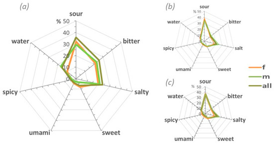 Radar charts of MSG taste profiles. Radar charts representing the taste perception described by the samples in the study. The umami taste description, whether extracted by the open-answer descriptors (a) or obtained in a test in comparison to a salt (b) or simple water solution (c), shows a consistent pattern across the whole group (all), subgroups (m, f), and tests (b,c). This consistency indicates that the umami taste was described as a complex combination of primary tastes with a predominancy of sour, bitter, and salty flavors, while umami itself remained unidentified. The scale, in percentage, refers to the total number of subjects in the group.