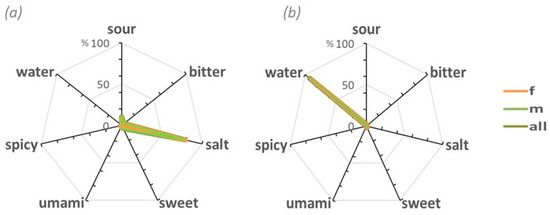 Radar charts of (a) NaCl solution and (b) tasteless solution taste profiles. The sample clearly identified the respective tastes for salt (90%) and water (97%), with no differences between females and males. The scale, in percentage, refers to the total number of subjects in the group.