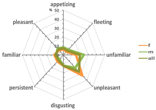 Radar charts of MSG hedonic perception described by the samples in the study. The umami perceptual profile is reported in four dimensions—appetizing (disgusting), pleasant (unpleasant), familiar (unfamiliar), and persistent (fleeting)—with opposite valence on the extremities of the axis. The categories were based on the open-answer descriptors. Overall, the entire group described the MSG taste as unpleasant and unfamiliar. In the charts, the entire group is depicted in olive green (all), while the female and male subgroups are shown in orange (f) and green (m), respectively. In the chart, the entire population is depicted in olive green, while the female and male subgroups are shown in orange (f) and green (m), respectively. The scale, in percentage, refers to the total number of subjects in the group.