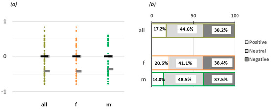 Text sentiment analysis (TSA) results. (a) TSA of the phrases pronounced in the open-answer description of the MSG solution. The median (black bar) and IRQ (grey bars) report on the point distribution. (b) TSA percentage of the hedonic components: positive (white), neutral (grey), and negative (black). All: entire group, f: females, m: male.