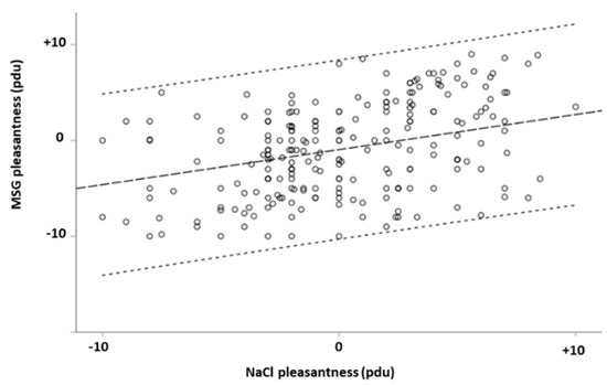 Whether the monotonic association identified by the Spearman rho correlation between the NaCl pleasantness ratings and the MSG pleasantness ratings was specifically linear was investigated. Linearity was established by visual inspection of both variables on a scatterplot. There was homoscedasticity and normality of the residuals. Then, with a regression model, how the pleasantness of one taste predicted the other was estimated. It was found that the NaCl pleasantness rating statistically significantly predicted MSG pleasantness ratings, F (1, 231) = 24.34, p < 0.001, accounting for 9.5% of the variation in MSG pleasantness with adjusted R2 = 9.1%, a medium size effect according to Cohen (1988) [40] (Figure 7).