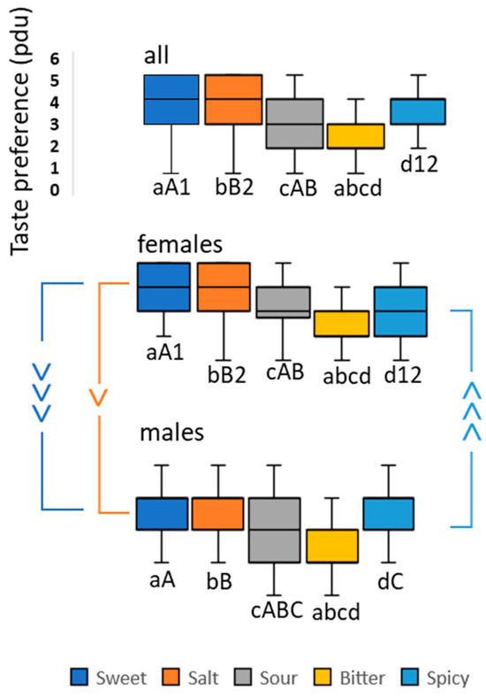 Box plots (median, IQR) of taste preference expressed as recalled experience on the Likert scale (0–6) for sweet, salty, sour, bitter, and spicy, organized in rows by group (all: entire group), and gender, and in columns by taste (sweet, salty, sour, bitter, and spicy). The statistical significance levels between groups are highlighted with “>“, where the angle bracket’s opening is in the greater value’s direction. Also: “>>>“, and “>” indicate p < 0.001, p < 0.01, and p < 0.05, respectively. Statistical differences within groups are highlighted by letters/numbers; the same letter/number indicates statistically significant differences.