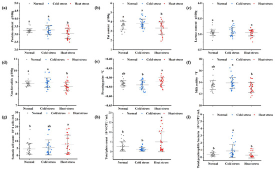 Physicochemical and biological indicators of raw milk. Note: (a) protein content, (b) fat content, (c) lactose content, (d) non-fat milk solids content, (e) freezing point, (f) milk acidity, (g) somatic cell count, (h) total colony count, and (i) total psychrotrophic bacteria count. Distinct lowercase letters signify statistically significant variations among the data (p < 0.05). Various colors in the diagrams on this page distinguish milk under different stress conditions; the gray data points signify normal milk, which is the unaltered milk produced when the cow is not subjected to thermal stress. The blue data points denote raw milk produced by cows experiencing cold stress, while the red data points denote raw milk produced by cows experiencing heat stress. There were 30 samples of each variety of raw milk, resulting in a total of 30 data points.