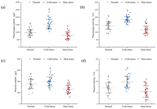 Plasmin system components in raw milk under different stress conditions. (a) Plasminogen content, (b) plasminogen activity, (c) plasmin content, and (d) plasmin activity. Every data point signifies a sample of unprocessed milk. Distinct letters (a–c) within the identical class signify significant variations (p < 0.05).